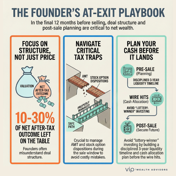 At VIP Wealth Advisors, we've seen this play out across many liquidity events. The founders and early-stage employees who thrive after an exit aren't the ones who sold at the highest valuation. They're the ones who treated their exit as a strategic transformation: financially, psychologically, and professionally.