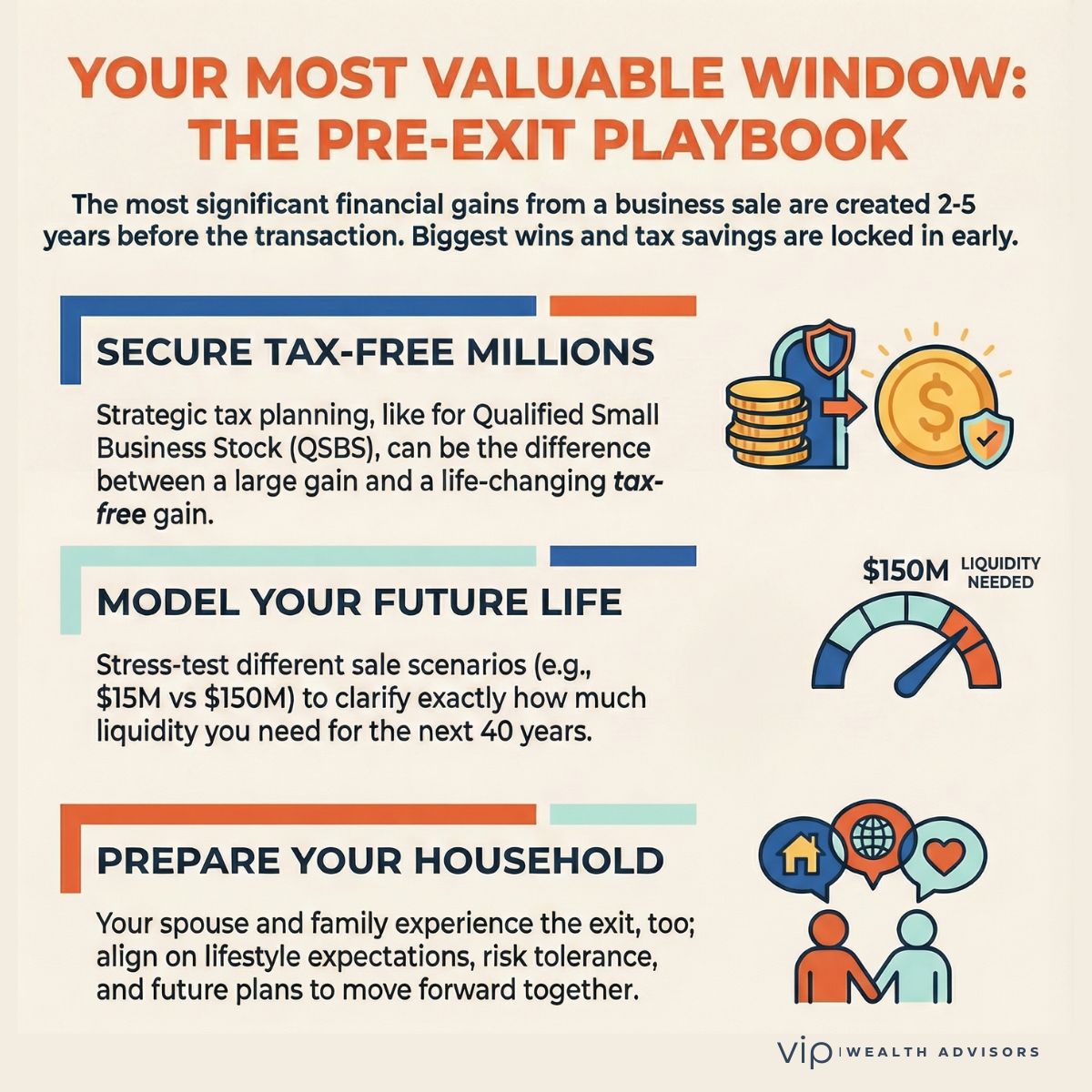 - The VIP Framework creates intentional outcomes. A staged approach helps founders preserve wealth, design purpose, and avoid common traps.