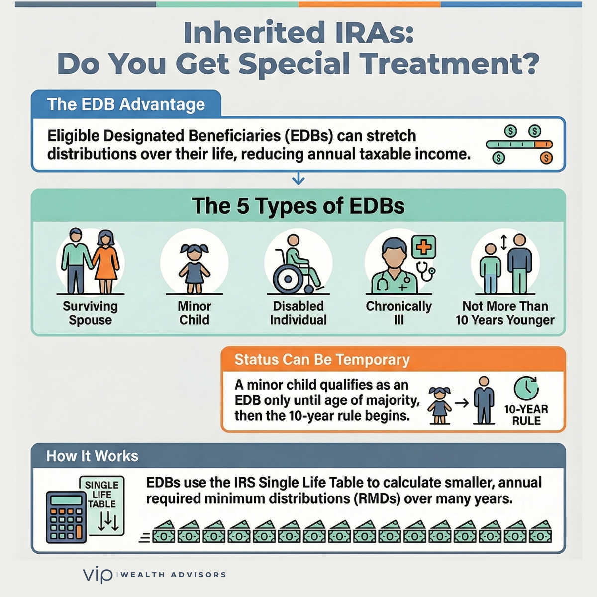 EDBs may take distributions over their own life expectancy using the IRS Single Life Table. This can dramatically reduce annual taxable income compared to the 10-year rule. However, this favorable treatment is not permanent in all cases.